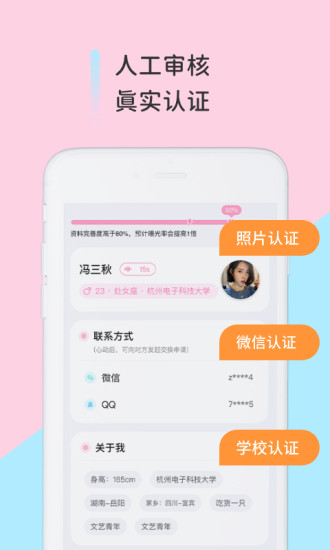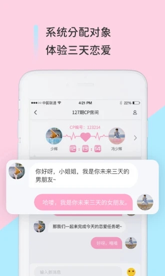 分配对象是单纯的交朋友应用,提供海量优质异性群体信息资源以及多种互动方式供您选择!在这里,您可以找到与自己志趣相投的人,并随时随地通过文字、语音等形式交流,寻找属于自己的缘分!