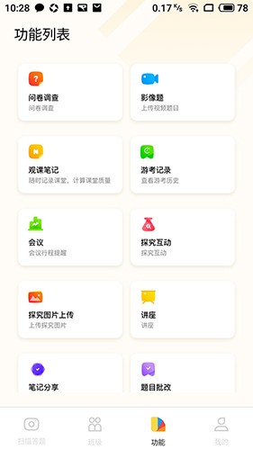 1、支持在线搜索相关资料或作者或者关键词查找知识点。2、海量题库供你刷,覆盖各个学科类型。3、线上即可报名参与,让你轻松参加各类活动。4、丰富的资讯文章任你选看,让您的阅读更加方便自由。5、实时更新最新的新闻头条为你推荐最新动态消息哦。6、各种各样的趣味视频随时播放欣赏,享受优质短视频带来的视觉盛宴。7、“我的课程”界面非常清晰明了,你可以更好地整理自己的个人课表安排以及购买到需要的课程哟。8、“我的订单”模块会自动地根据你的浏览情况推送适合你的购物车商品给你一键付款呢。9、“我的收藏”板块有着诸多精彩的文章全部汇聚在这里,点击就能进入详情页啦。10、“发现”栏目拥有着许多的功能和服务等待大家去探索~