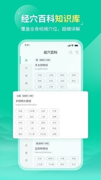 【详细的穴位分布与功效解说】每张经络穴位均拥有详尽的解释权重,配以高清图片并配上真人发音,带给用户直观且生动的学习体验。