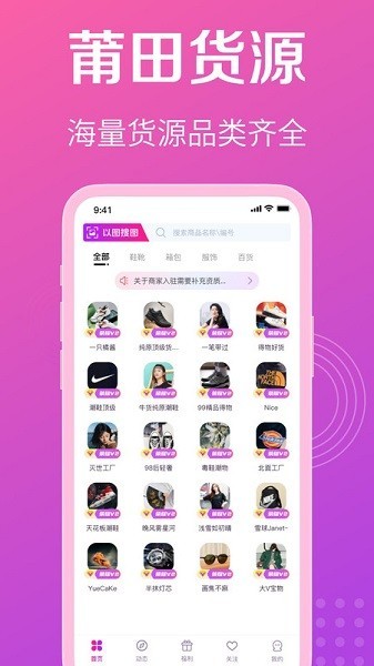 莆行微店货源app是一款专为微商和工厂提供的在线进货、找货批发服务的应用程序,该平台涵盖了丰富的货源资源与强大的搜索引擎技术;在鞋类、服装类、饰品类、箱包类、美妆个护、食品保健等多个领域均可找到所需货物类型并直接通过简单的搜索即可完成订单结算流程。