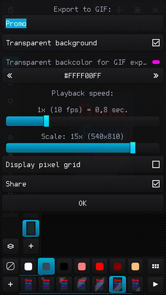 -使用“工具栏”,我们提供了一些像素图形制作工具,如油漆桶、铅笔,钢管,马赛克,橡皮擦和形状工具。您甚至还可以通过点击任何其他应用程序上的按钮将其拖拽到一个界面。您可以用手指拖动画板上的多个点来放大或缩小图层。此外,用户还可以使用触摸屏幕控制和按下手势来轻松更改颜色、亮度的饱和度和对比度。