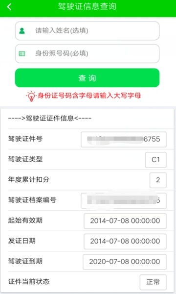 进入驾驶证查询界面输入姓名或者身份证号就能快捷准确获取驾驶证详细信息。