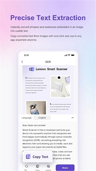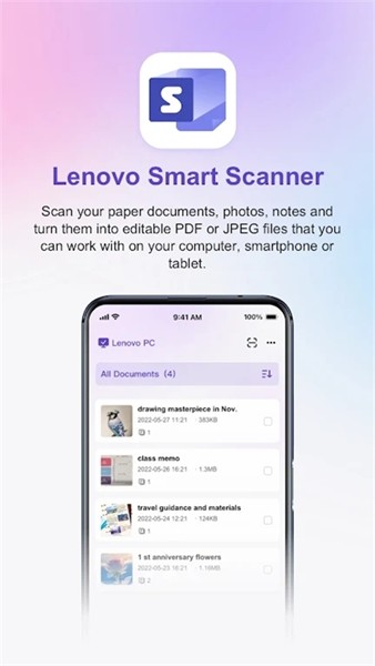 联想扫描王是联想公司旗下的一款手机扫描仪软件,该软件可以帮助你轻松将手机变成智能手机或平板电脑,随时随地打开应用程序进行扫描操作;通过该软件用户就可以对自己设备中的文件、图片以及文档等内容在线完成编辑处理功能。同时它还拥有强大的扫描识别技术能够快速准确提取出文字并自动转换为可修改文本格式的功能支持批量导入和一键复制粘贴到其它平台使用哦,有需要的朋友快来本站下载使用吧~
