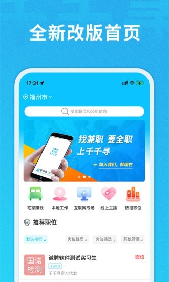 下载安装并打开千星寻应用程序,首先进入到首页后可以看到很多推荐的好工作,