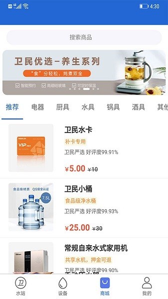 卫民净水是保洁新起点科技金字塔为全国会员量身打造的共享饮用水购买平台,这里有最新的智能设备可以进行线上选购使用。你可以在软件中快速搜索你需要的饮水量、饮用水产品并在线支付订水费用等操作哦。