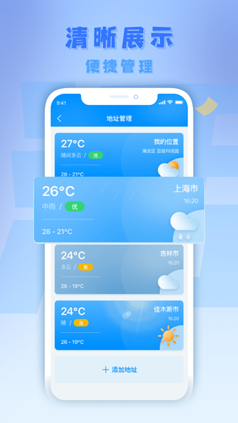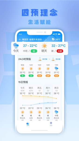 气派生活适合的天气服务类app是一款能够为用户提供天气预报查询服务的软件,在软件里能看到当天天气和空气质量情况,还能查看未来一周天气预报、风力指数等等功能。还有24小时预报以及日出天落时间等信息可以参考哦!