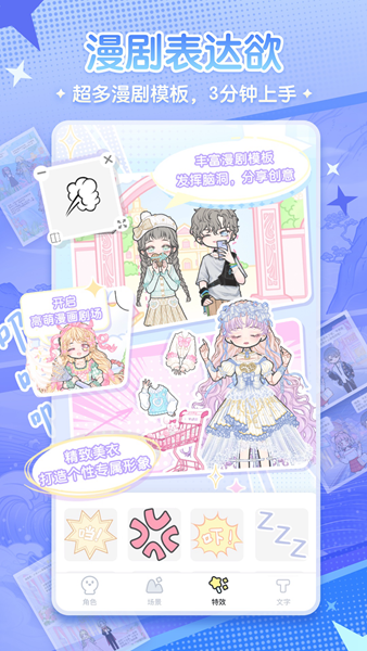 漫剧少女一款超级好用的支持用户在手机端进行二次元创作的平台APP,软件内置超多丰富的素材资源可以让您自由生成动漫角色形象风格百变多样化,还支持制作漫画和插画等元素哦!