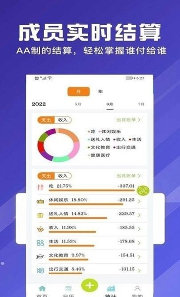 -数据统计:详细的数据汇总表展示了各种各样的账户详情以及收入及支出比例;