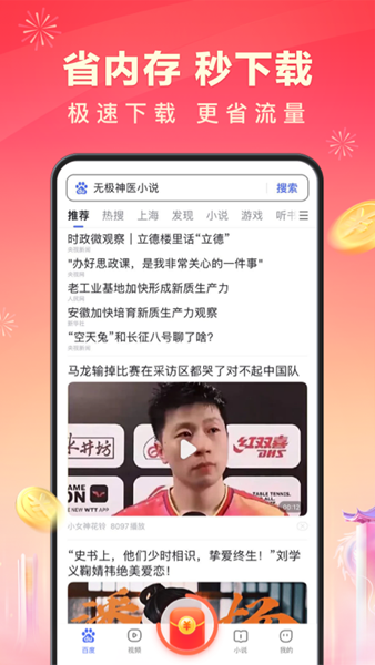 百度极速版浏览器2025是百度推出的一款手机浏览软件。在浏览器上,用户可以轻松找到自己喜欢的视频、音乐和小说等内容进行阅读体验。通过强大的搜索功能支持快速定位到想要的内容信息;同时还能根据个人喜好定制首页推荐资讯与频道选择适合自己的新闻动态!
