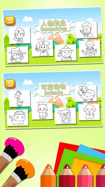 自由创作界面包含了多种模板任意挑选并导入制作成精美的涂彩画,培养小朋友对画笔的兴趣,提升审美能力;