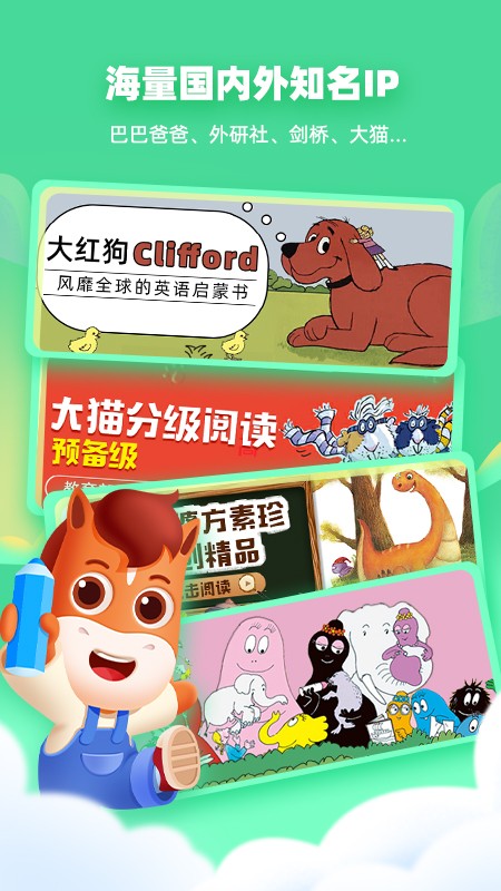 【精品课程推荐】根据每个孩子的年龄及能力制定专属学习计划;精选优质原创英文动画,激发宝贝的口才表达、记忆力,帮助宝宝全方位掌握常用英语单词;智能推送适合不同年龄段孩子的英语学习任务:听说读写练习、同步训练、重点难点强化训练、阅读思维训练、语言能力训练、自然拼读、品格养成、艺术修养与成长等内容。