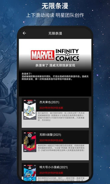 漫威无限app由官方出品,作为一款专为读者打造的移动阅读软件,旨在提供丰富的阅读内容和便捷的服务。它不仅提供了多种不同类型的漫威漫画资源供用户选择观看;还通过智能推荐功能帮助用户发现更多感兴趣的漫画作品并与好友分享喜爱的作品。