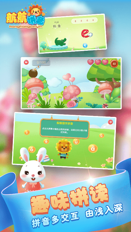 通过动画+儿歌的形式将知识点融入到孩子的日常互动中,让小朋友在轻松快乐的环境下快速掌握拼音字形与发音要领,帮助孩子们高效地掌握汉语的全部知识点,同时还配有趣味性的游戏玩法,加深记忆。让孩子在玩耍的过程中不知不觉学会拼音。