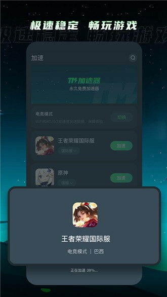 TM是一款专门针对安卓设备打造的手机游戏网络优化神器,这款应用采用全新的智能匹配技术和智能线路选择技术,能够有效减少延迟、掉线、卡顿等问题,提升游戏体验。同时,应用还提供多种辅助功能如自动重连、实时监测网络连接状态等,让用户在游戏中享受到更为流利、高效的网速表现。此外,该应用还支持海量的手机游戏资源供玩家随意的选择并直接安装至手机上,满足不同游戏需求。