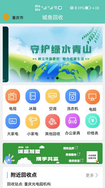在城鱼回收APP首页面右上角菜单栏中点击“我要加盟”。