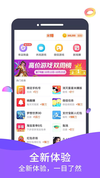 米赚手机赚钱用户获取收益app是一款非常不错的网赚应用软件,这款软件能够帮助用户进行线上试玩、在线签到以及邀请好友来完成任务就可以得到奖励,让你随时随地轻松做兼职;米赚手机赚钱用户获收益安卓版里面还拥有超多丰富多样的小游戏供你选择玩,通过各种好玩的游戏让大家可以更快速的掌握自己的时间安排和效率等情况。