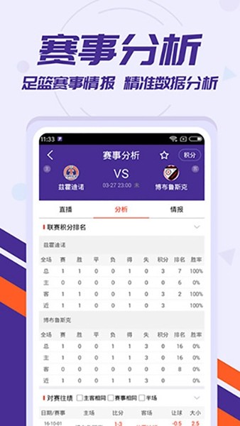 3.【情报预测】提供准确的赛程比分及赛事积分榜,对阵双方伤停情报进行预测分析推荐给球迷;