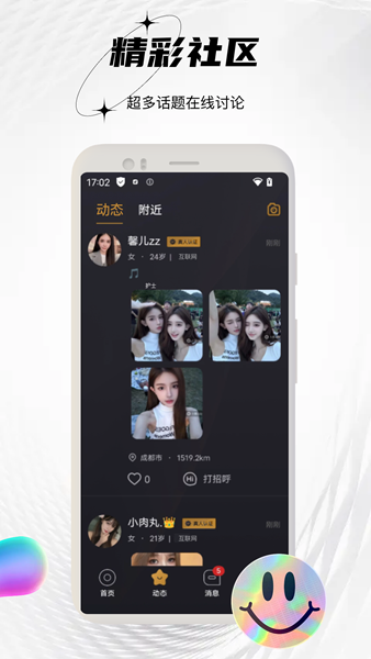 在小圈APP里,你可以通过文字、语音或视频的方式表达你的情感,让你随时随地都能轻松认识有趣的灵魂伴侣;也可以在这里分享自己的生活动态和心情,让更多志同道合的人一起讨论彼此,共同探讨生活中的各种问题。