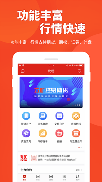 五矿经易app是专门为五泰证券旗下的期货投资人量身打造的一款手机交易软件,它以专业、高效的方式满足不同用户的使用需求,让大家随时可以轻松在线进行操作。软件界面简洁明了,功能齐全且强大,能够帮助大家快速掌握各项金融资讯信息和行情动态;同时软件还提供了海量的股票品种供用户自由选择购买与管理个人资产等各种服务体验!不仅如此,五钻石模拟炒股大赛还有各种各样的免费学习课程可参与进来让你更好的提高自身的炒股水平,感兴趣的朋友欢迎前来本站下载哦~