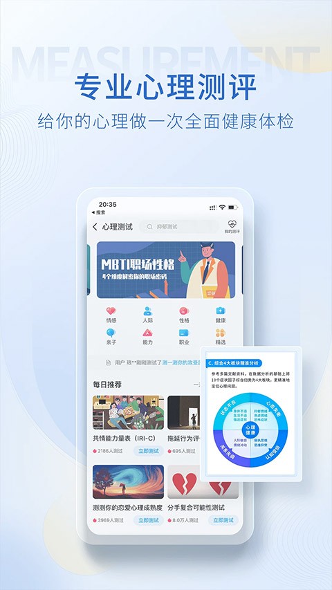 强大的专业评估系统,帮您探索未知世界的奥秘。涵盖恋爱交友、婚恋情感、焦虑症等等,全方位满足您的心理测试需求!