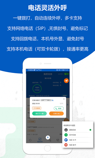 提供多种话术套餐设置选项,包括虚拟电话、模糊查找、智能拨号、智能导入通讯录、智能拨号、智能拦截黑名单等等,全方位满足用户的需求。