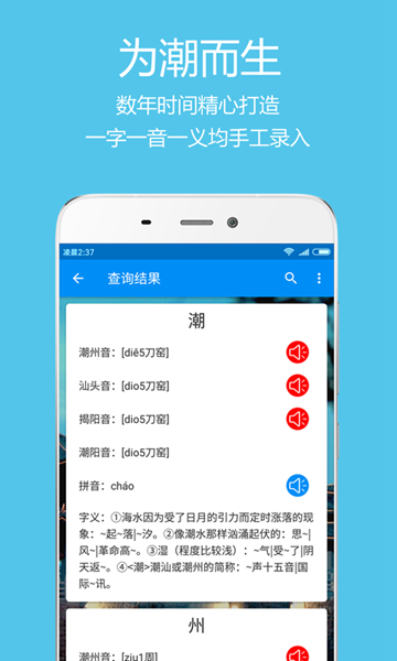 潮州音字典是专门为潮汕话的人群打造的一款手机应用软件,用户可以使用潮州市音字典进行汉语和普通话查询功能;潮山市音字典app还提供了海量的潮汕话词汇内容供你参考学习,帮助潮州市的人们更好地掌握潮阳话的发音规则以及使用方法,欢迎下载潮江市音字典。