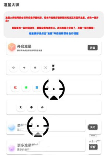 【配置】页面有:十字准心、暗角准星、文本符母准心;(默认是透明的)以及高级模式(部分机型有限制);