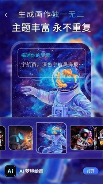 AI梦境绘画是为人们所提供一个非常方便的智能生成软件,用户只需输入自己想要的图片风格即可进行一键自动创作并分享到朋友圈或者其他社交平台上。同时在ai梦境绘画中你也可以选择自己喜欢的风格来为你呈现,让你可以轻松制作出属于自己的梦境,喜欢这款AI梦境绘画的小伙伴们千万不要错过哦!