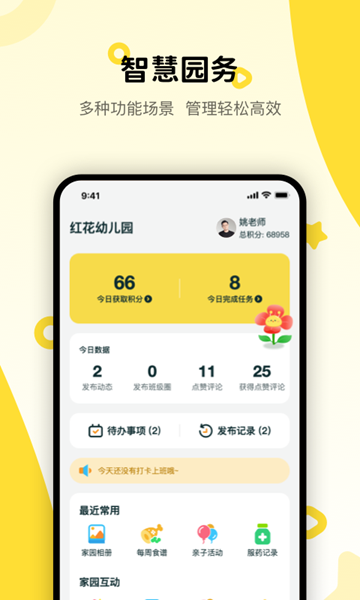 随时随地发布孩子的活动资讯,并实时推送至家长手机屏幕上,让家长不错过孩子在校的每一刻。