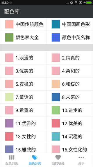 1、首先下载配色库app,然后打开,在这里你可以看到很多专业的色彩分类哦!