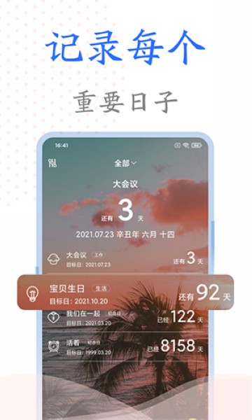 一款能够帮您记住生活中每一个重要日子的应用程序,通过它您可以轻松地查看和编辑您的重要纪念日、生日等信息,不再错过任何的重要日子。