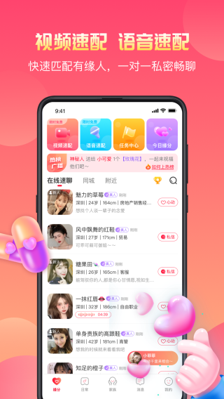 为热衷交友的用户提供更高效、安全的信息匹配服务,在这里可以随时与你喜欢的人约会、相亲,一起探索异性生活,结识新朋友!