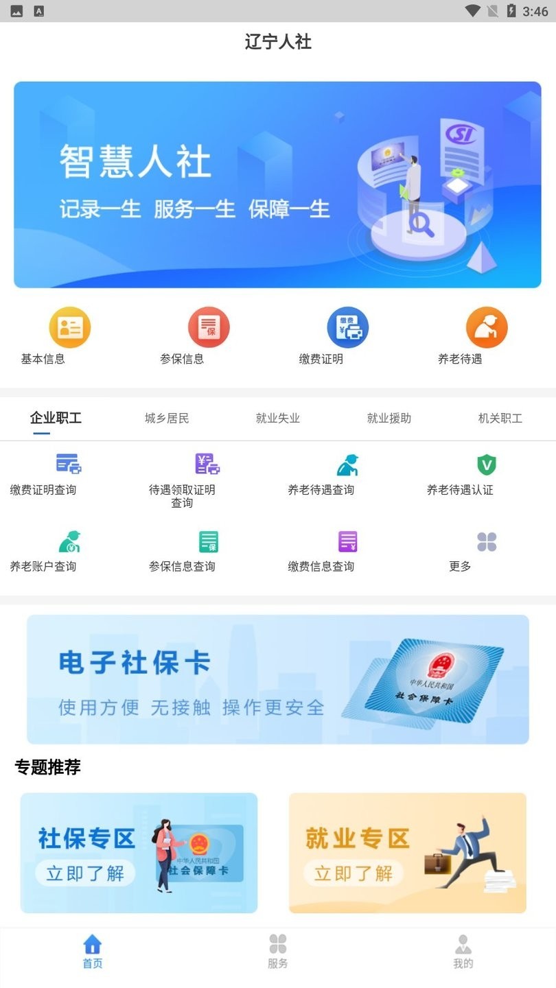 辽宁人社app是专为辽宁省人力资源和社会保障打造的一款社保服务软件,该平台由官方权威出品而成。在这里用户们可以轻松获取本人电子社保卡、缴纳养老保险、医疗保险、失业社保等等在内的多种内容和服务!同时其中还提供了参保信息查询、政策法规浏览、办事指南分享等一系列实用功能哦,让广大用户足不出户就能在手机上完成相关操作呢。另外为了方便用户的使用体验,辽宁人社社保认证系统最新版也提供了非常多的便捷式生活服务的便利性哟,且界面简洁易懂,十分友好的使用环境!