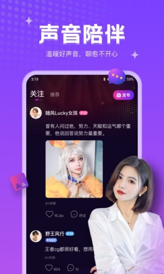 5、语音交谈:多人语音连麦房间,唱歌热舞、游戏互动、处cp......声优陪你玩,一起畅聊,开心畅听。