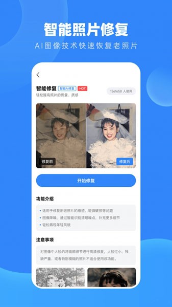 旧照高清修复是款好用的手机照片编辑软件,在这里快速进行图片上的处理。各种滤镜和特效等内容我们需要选择适合自己的工具开启体验更加方便用户们在线轻松制作出自己满意的照片效果!喜欢的朋友速速下载吧