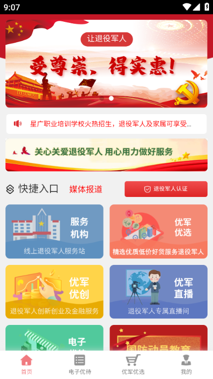 3,在优军码APP通过实名认证成功后,进入“优军码”APP首页点击“立即办理”“优军政策”“优军活动”“优军公益”“优军优工”等栏目中自主申报入驻,并开通工会身份验证功能。