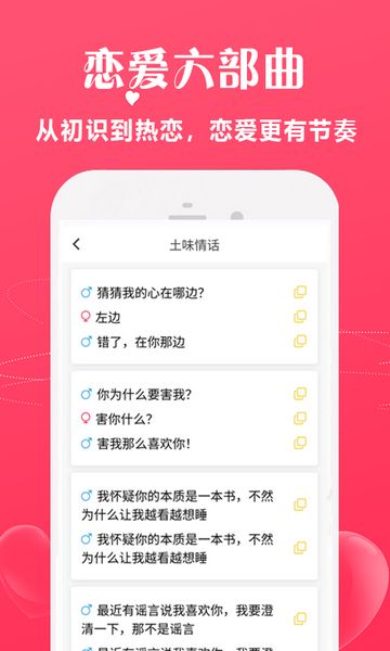 包括社交圈子、约会、情感问答、土味情话、聊天话术等众多精彩分类,