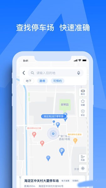 输入目的地名称或者地址就能找到周边最近的停车场位置了。