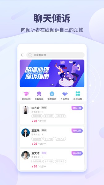 【心理咨询】提供心理咨询、心理课堂、心理课程、情感课程、婚恋情感课程、亲密关系、职场发展、焦虑症等多个类别,涵盖婚姻家庭、情绪压力等多个领域,满足用户不同的需求。