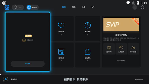 当贝酷狗音乐app中免费收听歌曲,当贝乐库,听歌必备!海量音乐资源、最新专辑随时播放。热门榜单随心听,想听什么就听什么,千万曲库任你选,喜欢唱歌的小伙伴不要错过哦。