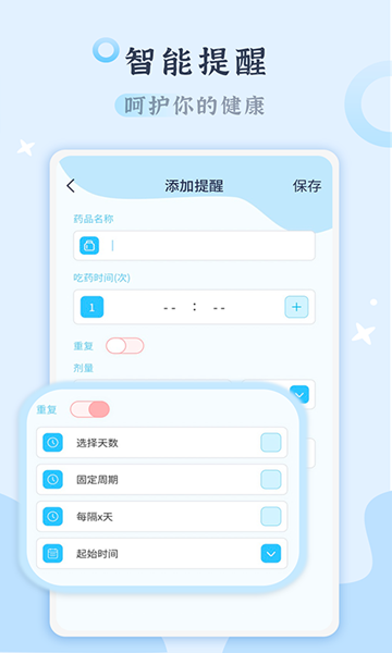 提供了丰富多样的功能选项与便捷的使用体验:不仅支持日常用药提醒及健康评估(如体温监测)工具,还允许用户自定义设置药物的用量和频率,方便及时调整和控制使用;
