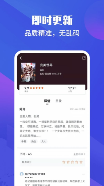 【1亿书库】百万册图书随便看,玄幻奇幻、武侠仙侠、都市言情、青春校园、穿越架空、惊悚悬疑、历史军事、耽美同人,你想看的这里都有~;2千万本书籍全部正版,全部精品,为你实时生成章节目录;3、新增漫画板块,海量漫画每日连载,给你带来最新、最热的漫画盛宴!