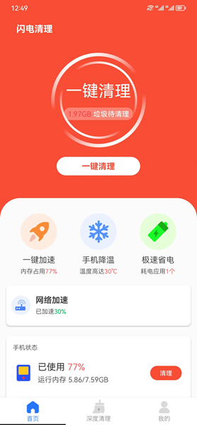 闪电清理助手是一款非常受欢迎的手机内存清理工具,它可以一键扫描出手机里所有文件和垃圾数据。同时,这款软件还能对应用程序进行深度分析优化,从而快速清除掉不必要的应用缓存和残留文件。