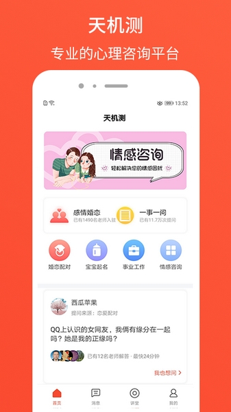 4.【恋爱婚姻】-专业团队,为你倾力打造最适合您爱情、工作、事业等方面的心理健康问题解答工具,帮你从此告别尬聊。