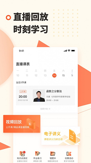 一线教师全程陪伴式直播指导,每堂课都配有专业老师精讲课件,支持缓存下载功能哟~