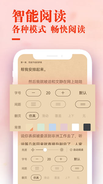 4、个性化设置:支持背景颜色选择,字体大小调节以及翻页方式调整等多项人性化设置,打造专属阅读空间。