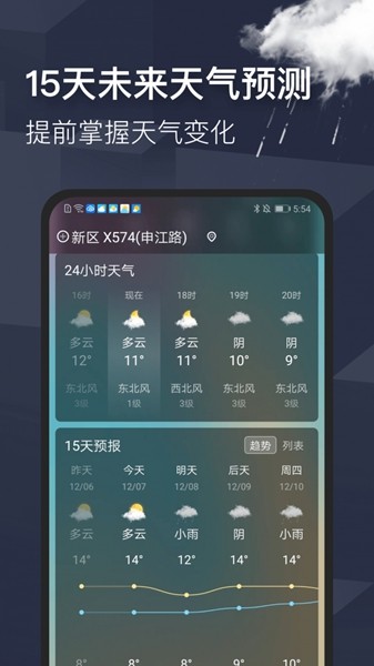 多维度的天气预报应用程序,包括气温、体感温度、污染程度以及未来的日出、月落时间等。