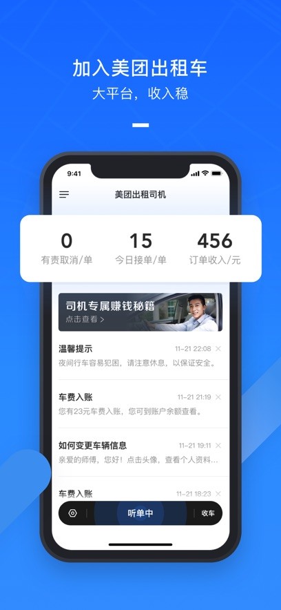 不仅如此,该平台内置海量真实客户信息可供用户查看了解使用,并通过大数据分析与人工智能技术手段进行数据挖掘和处理,确保出租车行业中具有较高的收入来源。另外,美团出租司机登录作为一名司机身份验证后即可随时随地自由抢单工作赚钱,还提供了超多丰厚福利活动可以参与报名领取,让广大网约车司机师傅们每天都能赚取更多的收益,有需要的用户快来下载试试吧!