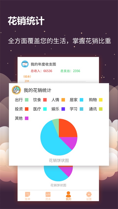 【图表统计】:将每一笔钱都在做什么,直观呈现你的财富变化,让你清楚了解每月收入和支出的比例,实现决策支持。