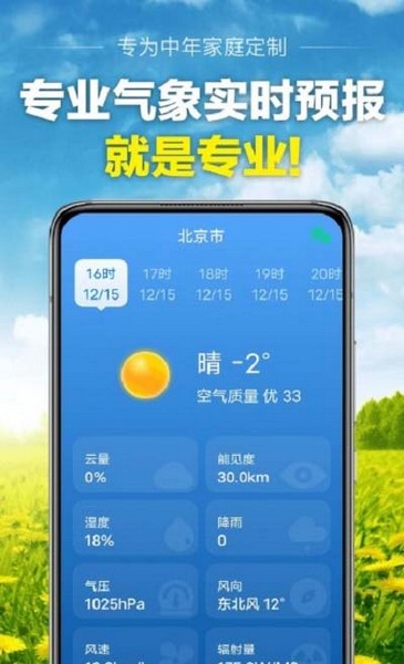2、24小时天气预报:随时随地查阅晴雨雪的城市风力大小。